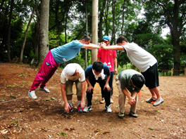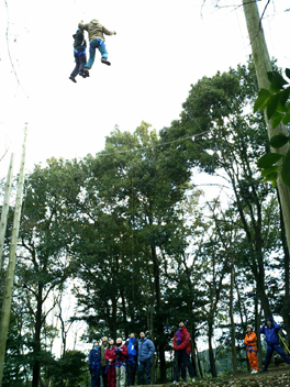 8メーター程の高さに設置されたワイヤーや丸太の上を渡ります。地上からのビレイは届かないので、命綱をつけてチャレンジします。命綱はファシリテーターがビレイヤ−(安全確保者)として握りますが、活動目的によってはメンバー同士が握りあう事もあります。